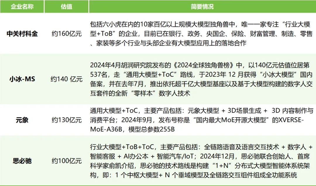 六小虎之外,2024年,市场上还至少出现了其余4家估值在百亿元以上规模的大模型独角兽——众闯信息科技、小冰-MS、元象以及思必驰。