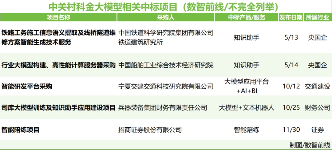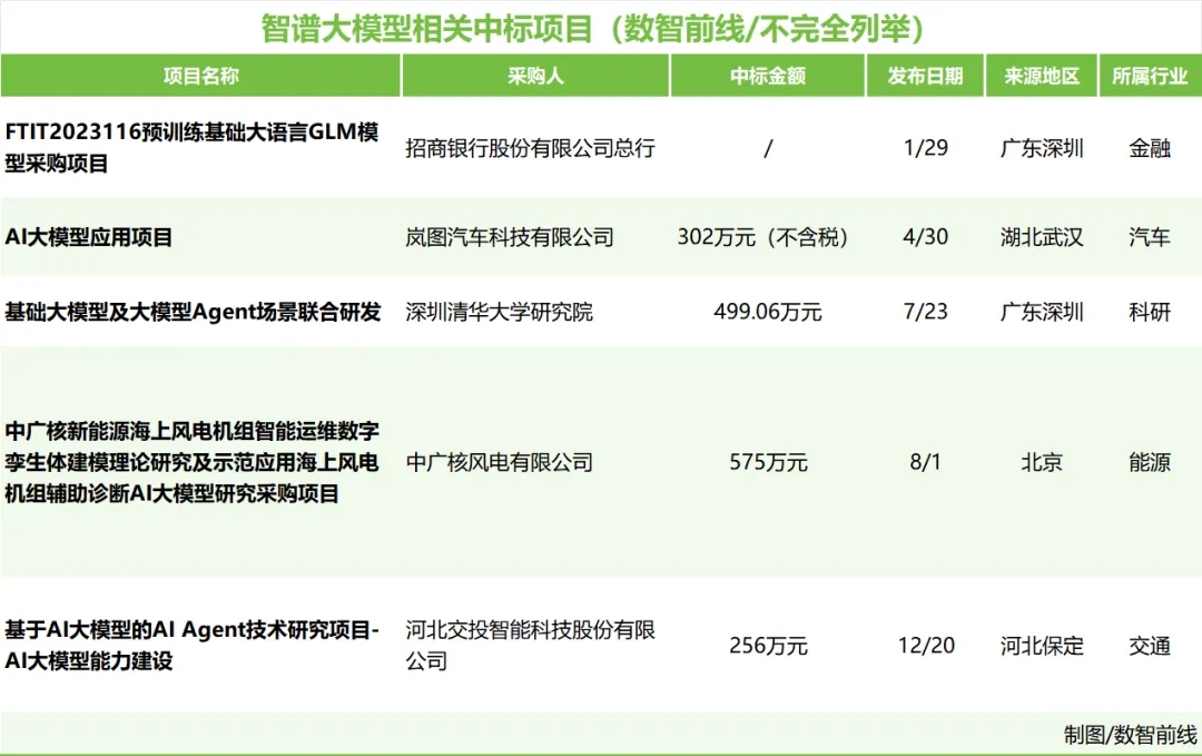 据数智前线不完全统计,2024年,智谱至少中标了28个大模型相关项目,涉及能源、金融、教育、汽车、政务、运营商、科研、交通物流等多个领域。其中,不仅包括基础大模型、应用项目的采购,也包含了人才培训项目。
