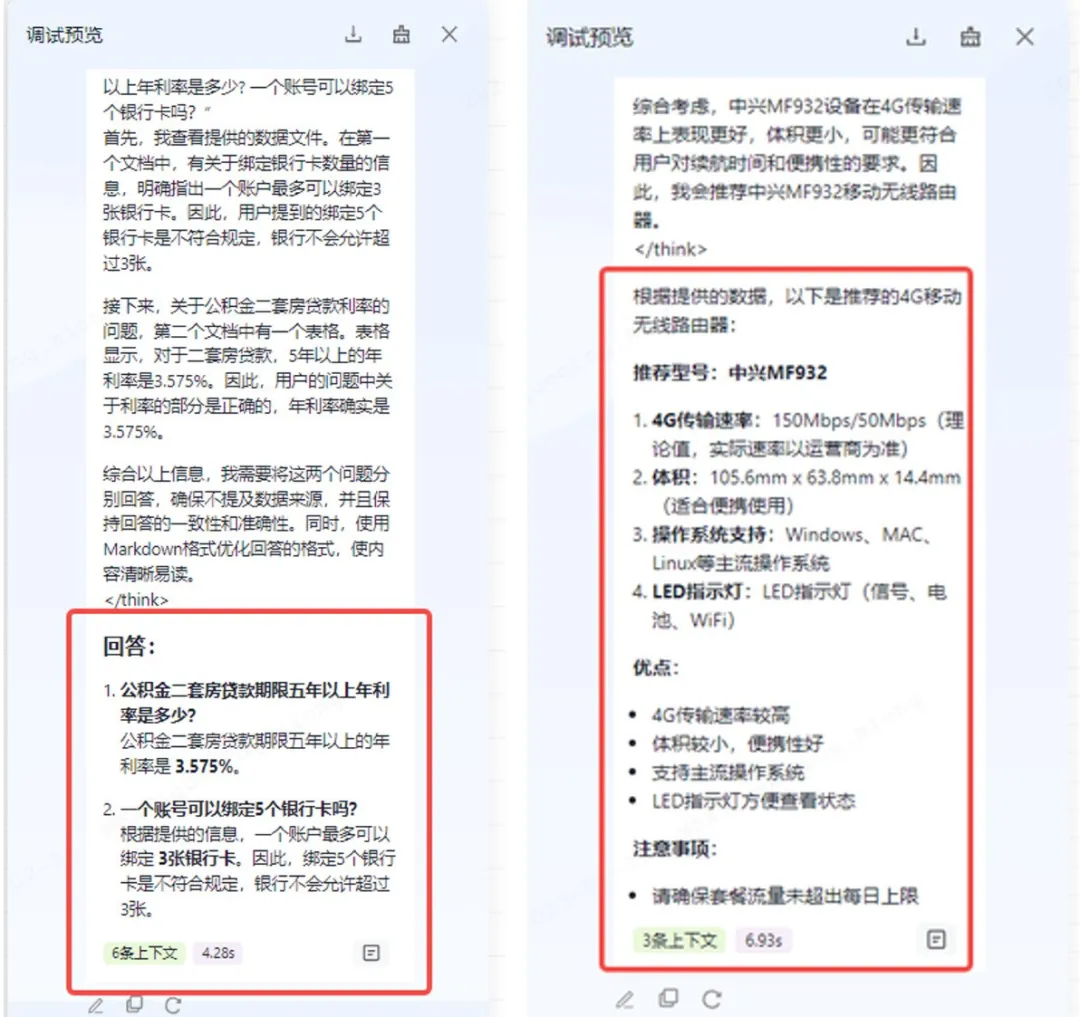 实测:当前通用开源大模型准确率普遍为79.8%左右,我们在真实的金融业务场景中进行实测,其中DeepSeek-V3(通用型)准确率为95.1%,DeepSeek-R1(推理型)的准确率为94.9%。整体准确率提升了15%,极大地提升了复杂文本问答场景的商用价值。同时,V3版本比R1版本效果更好,也充分体现了两个版本的特性区别。V3更擅长处理标准化任务,结果稳定但缺少创新。而R1版本更擅长复杂推理任务,通过推理能力生成更具创新的结果。
