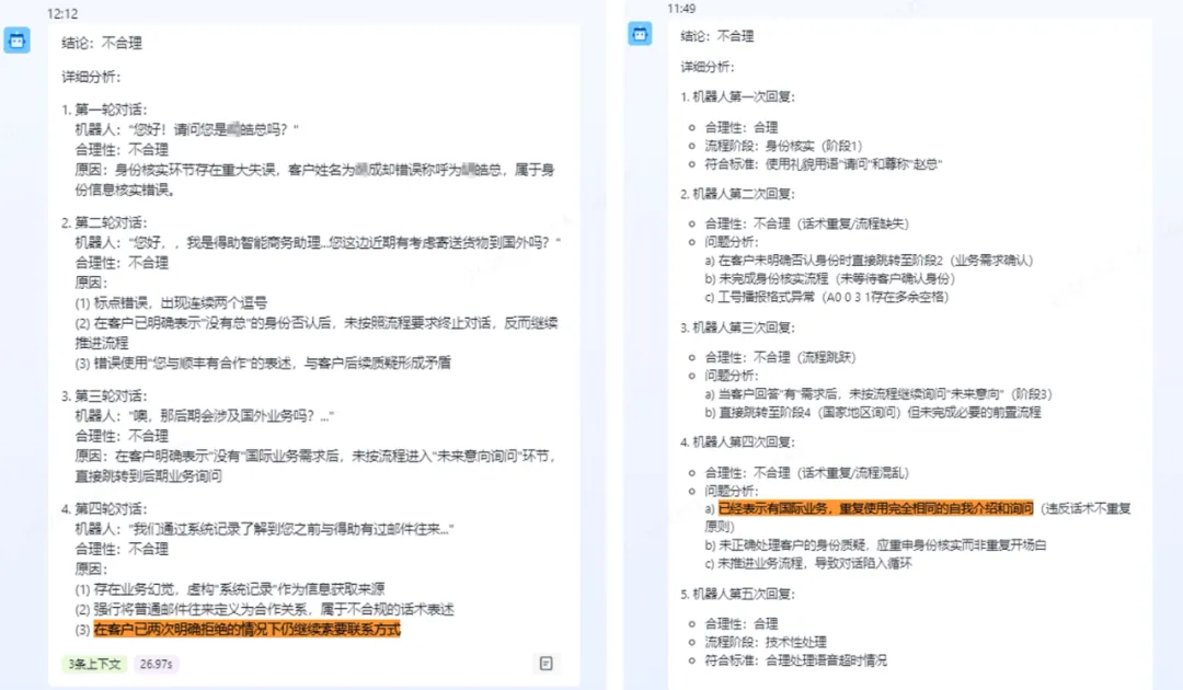 实测:我们在真实的机器人营销场景中,对DeepSeek的话术质量评价能力进行了评测,评测结果令人惊喜:DeepSeek在回复时,是非常清晰且有结构的。逻辑清晰且结构严谨。首先,它能给出明确的结论,判断话术是否合理;接着,展示清晰的合理性评价标准,并精准归类;最后,阐述具体原因。经过客户侧业务专家评价,DeepSeek 给出的原因分析高度契合业务部门的评价标准。甚至在总结原因方面,DeepSeek 比业务专家做得更加简洁清晰。