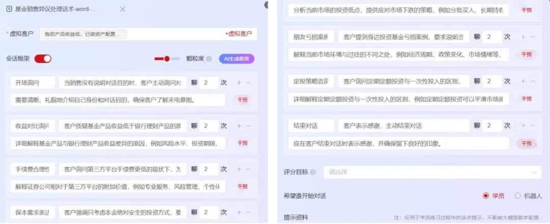 场景:在金融领域,理财顾问的营销效率一直受限于金融产品的复杂性与专业性。行业目前标准的解决方案是引入智能陪练系统,通过AI机器人对销售顾问进行持续的营销陪练,机器人模仿目标客户,销售顾问通过多轮对话持续与机器人沟通,来快速提升营销能力以及增加对产品的熟练程度。从而快速提升金融机构整体营销效率。在AI陪练机器人创建时,陪练系统需要根据客户的业务背景知识、营销目标、产品信息、陪练计划等多维度的信息,人工编写对练脚本,极大占用人力资源,且对人的业务能力有极高的要求。
