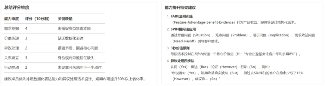场景:在陪练系统中,每一次陪练结束,系统都需要根据该员工的实际表现,给出明确的评分以及评价,以此来量化学员的实际表现。以便后续为学员提供更加个性化、更有针对性的提升建议,帮助学员针对不足进行优化,持续提升培训效果。