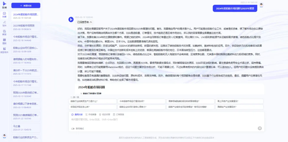 专业领域知识问答。基于百舸大模型对船海领域知识的深度微调,结合DeepSeek-R1的长思考能力,提供涵盖船舶技术、市场趋势、客户营销等复杂问题的精准解答。
