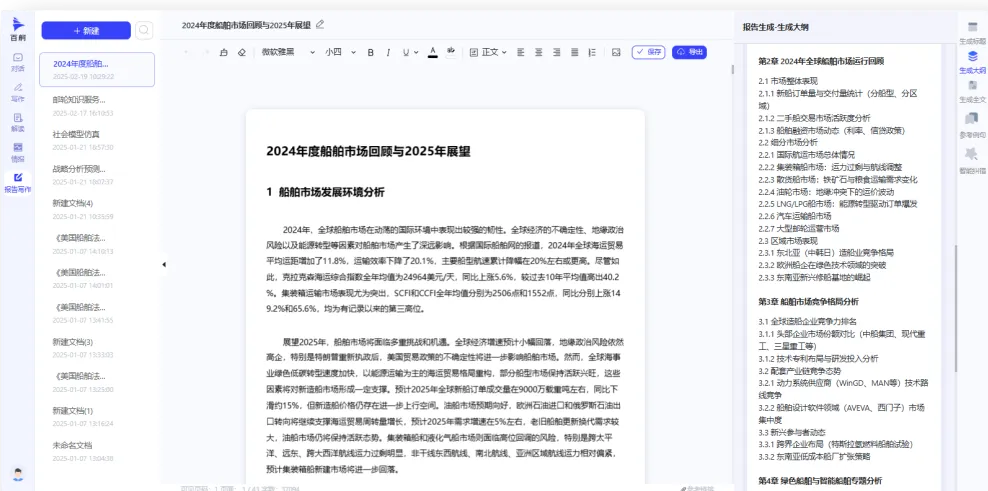 系统内置2000+行业语料模板,智能推荐经研报告、行业白皮书等8大类文档结构,通过语义理解引擎自动匹配政策法规、市场研究等船舶领域的专业表述规范。